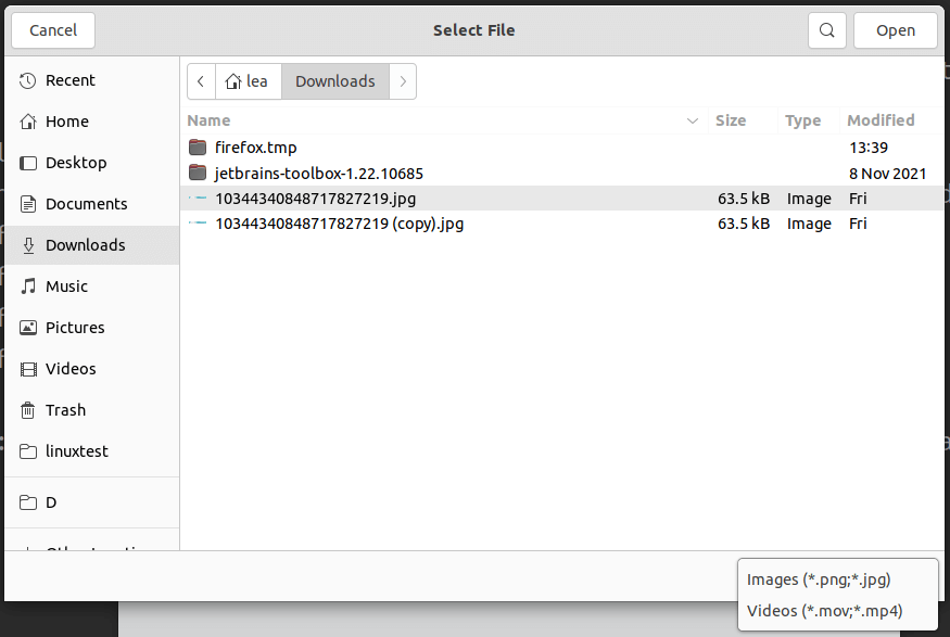 这将导致使用 *.png,*.jpg,*.mov,*.mp4 作为过滤器打开文件对话框。